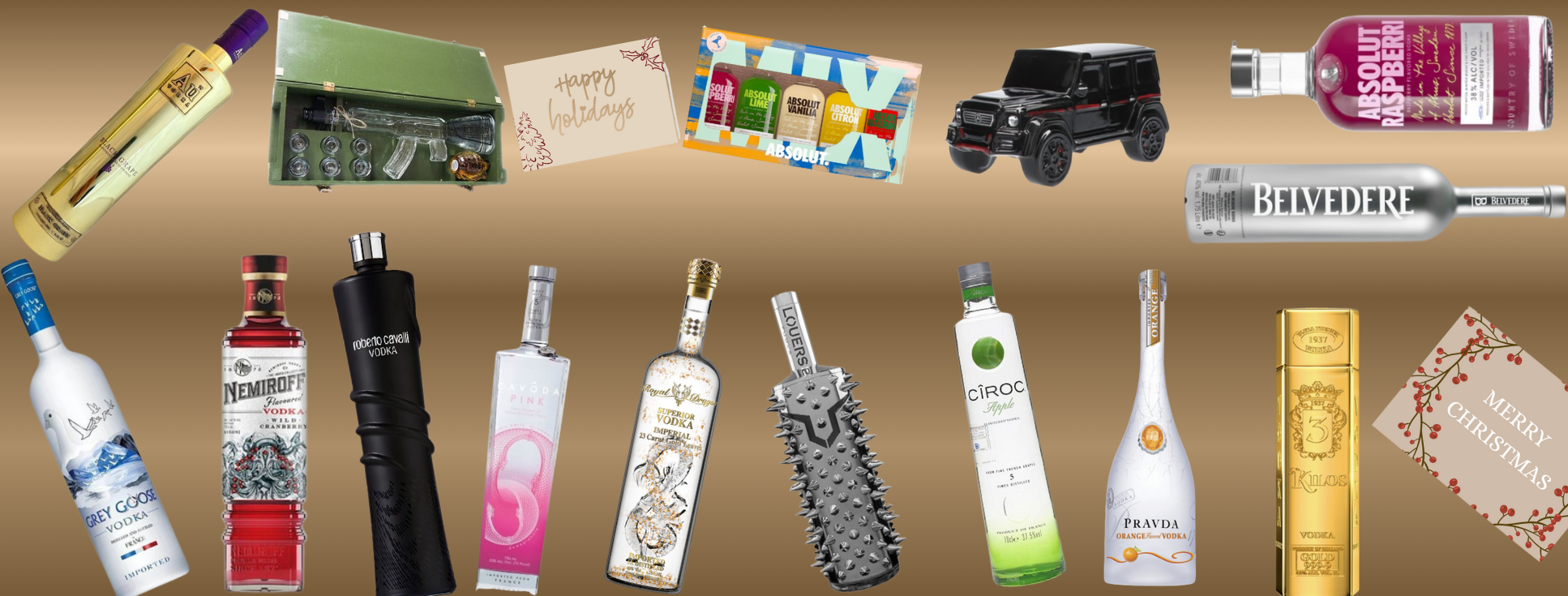 Denk aan premium vodka's zoals Belvedere, Grey Goose, Cîroc, Ketel One of luxe giftpacks met glazen of cocktailaccessoires. We kunnen ook duo-sets maken, zoals twee verschillende vodka’s of een vodka + glaswerk set in een houten kist.